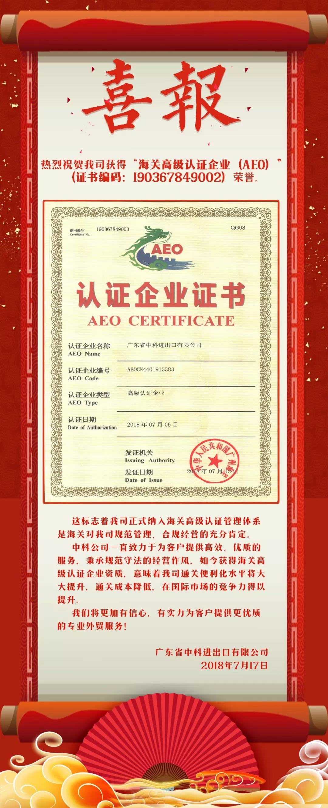 热烈祝贺我司获得“海关高级认证企业(AEO)”荣誉